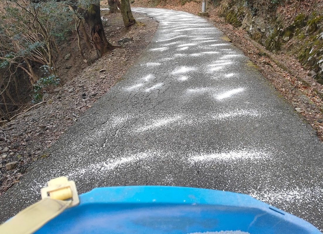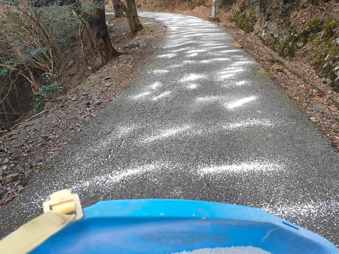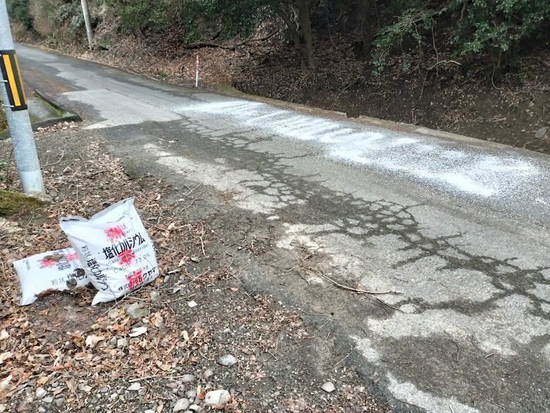 先日、そんな冷え込みが予想される前日に、近所の方々と一緒に集落内の急勾配な坂道に「凍結防止剤」を撒く作業を行いました。