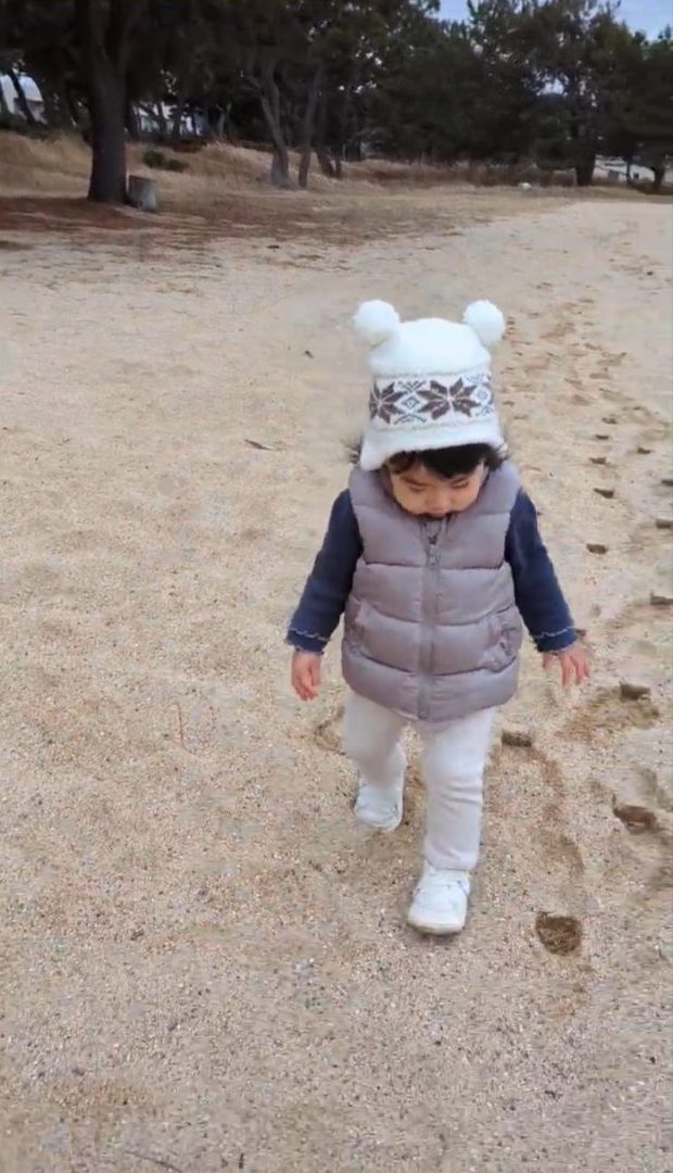 風に負けず砂浜を歩いた1歳の頃の娘