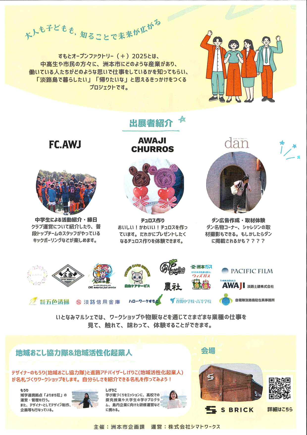 「すもとオープンファクトリー(+)2025とは、中高生や市民の方々に、洲本市にどのような産業があり、働いている人たちがどのような思いで仕事をしているかを知ってもらい、「淡路島で暮らしたい」「帰りたいな」と思えるきっかけをつくるプロジェクトです。