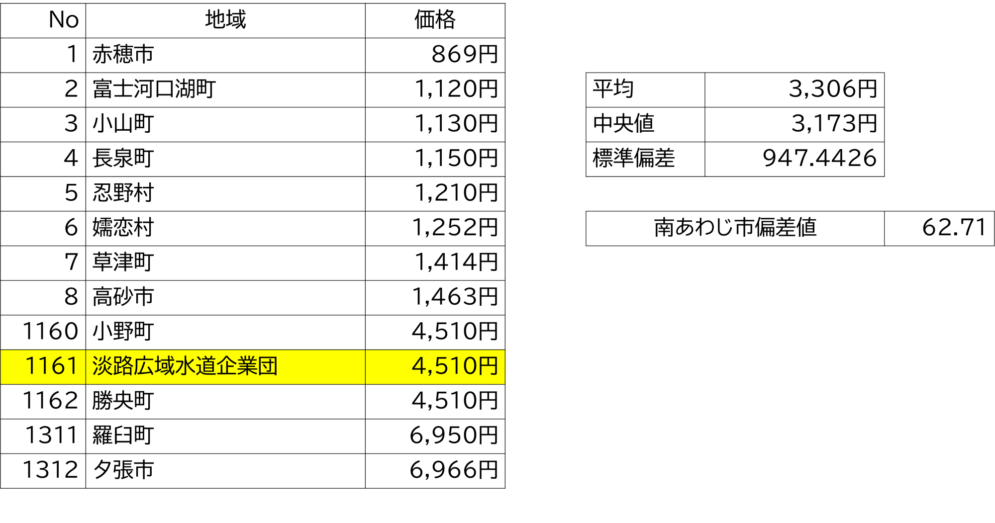 令和2年度の水道統計によると、計測できる1,312地域の中で安い方から1,161番目、偏差値を出してみると62.7と価格の高い上位10%には入っているかなりのエリートです。