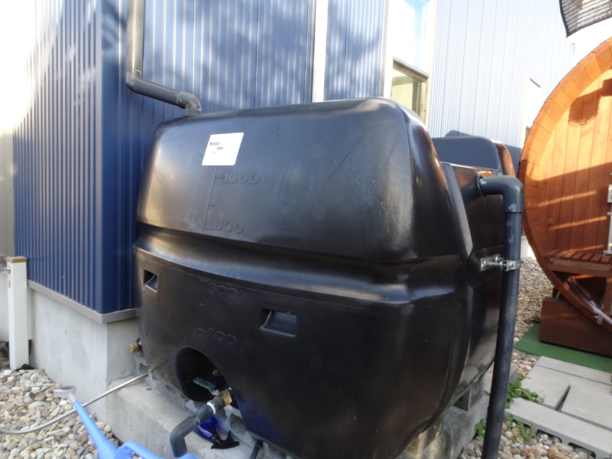 そして、こちらが1,000ℓのタンク。こちらも普段は庭木の水やりに使っていますが、容量が多いからか水圧がすごいのでホースをつなげば消火活動にも使えそうです。