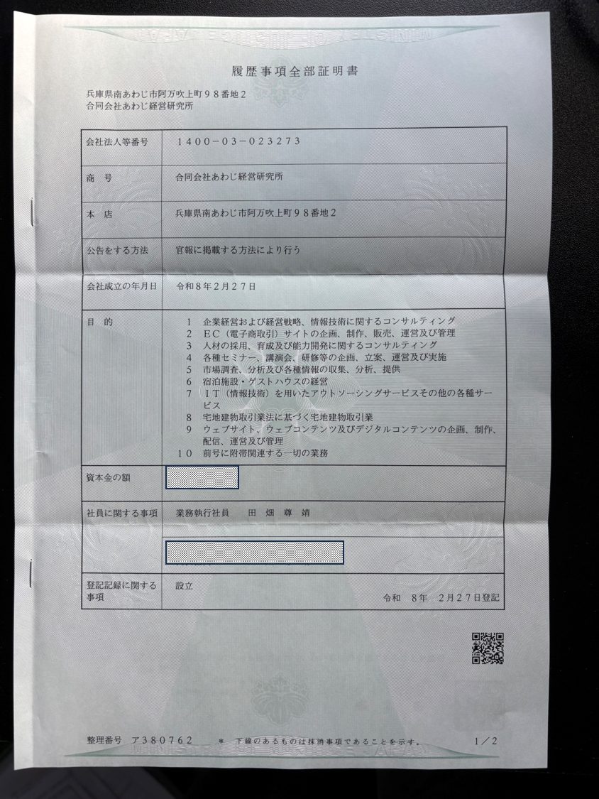 と言うのも、各種窓口に色々な届出をする必要があり、履歴事項全部証明書を3通取得して、①市役所の税務課で届出、②年金事務所に連絡して、書類を郵送(淡路島の場合、最寄りの事務所が明石なんです)、③税務署への届け出(オンラインで出来そうなんですが、まだやってませんm(_ _)m)、④銀行口座の開設、⑤決済用クレジットカードの申し込み、⑥法人用会計ソフトの申し込み、などなど盛りだくさんです。しかも私の場合、お試し住宅(先月のブログに載せたやつです)を本社住所にしてしまったものだから、慌てて郵便ポストを設置し、郵便物を毎日確認しないと④や⑤の手続きが進まなくて。。。1週間ほどバタバタしてました。